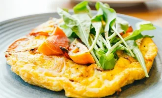 - Låt stå under lock i 10 minuter. Servera med stekta champinjonskivor och skivor av bringa.